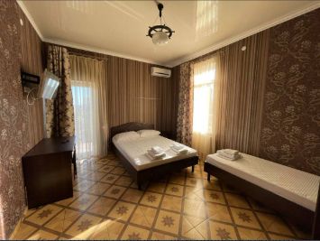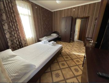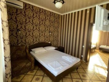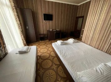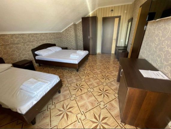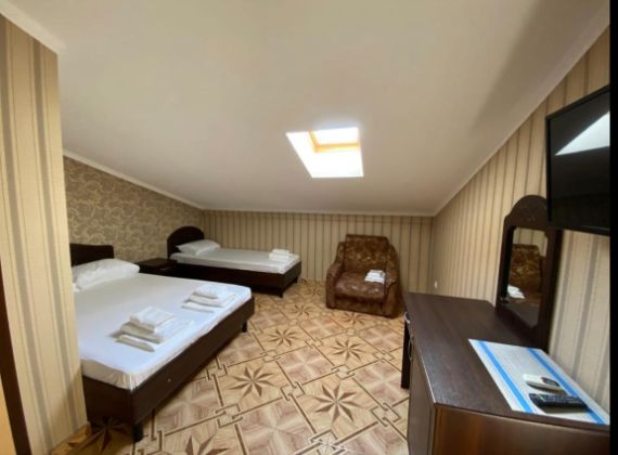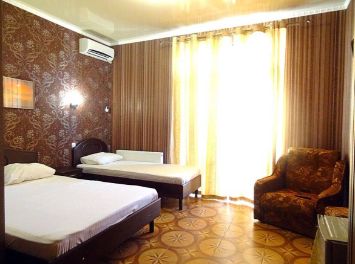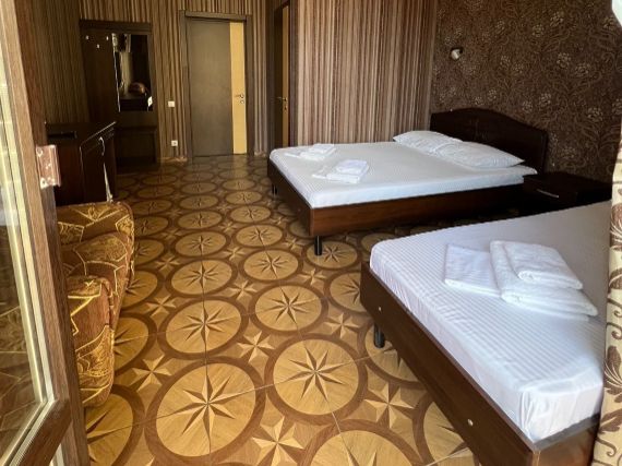 В номере комфортная мебель: двуспальная и односпальная кровати, кресло кровать, сплит-система, телевизор, холодильник, прикроватные тумбы, шкаф, туалетный столик, санузел. Без балкона.