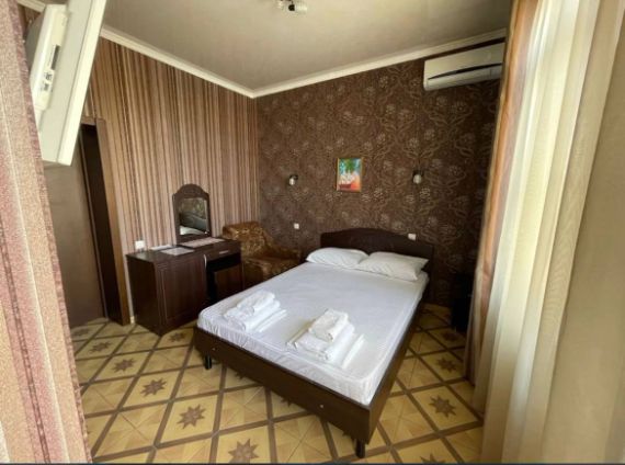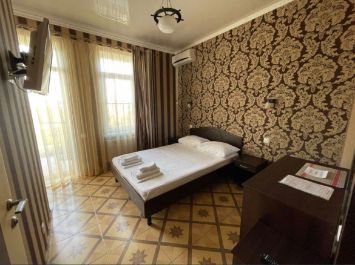В номере комфортная двуспальная кровать, прикроватные тумбочки, туалетный столик, шкаф, телевизор, холодильник, сплит-система, фен, санузел.